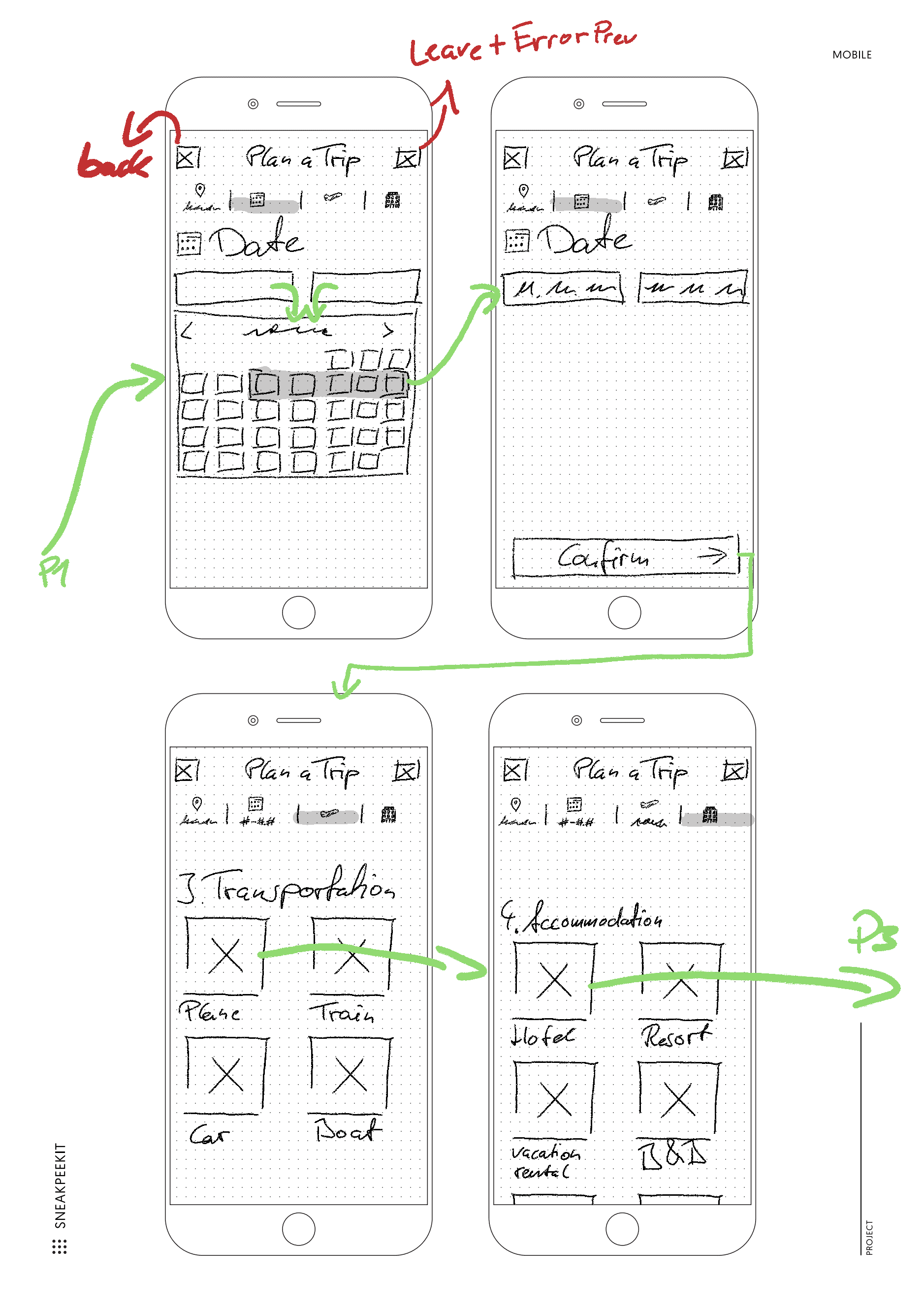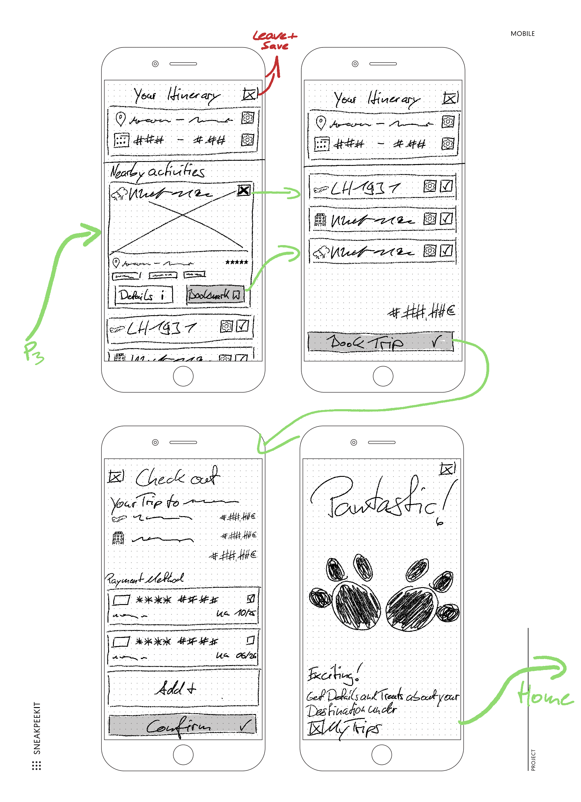 Designed a mobile‑first paper prototype of a wizard‑style Travel Itinerary Concierge: trip kick‑off, destination and dates, transport and accommodation choices, curated itinerary, clear policy views, and booking confirmation.