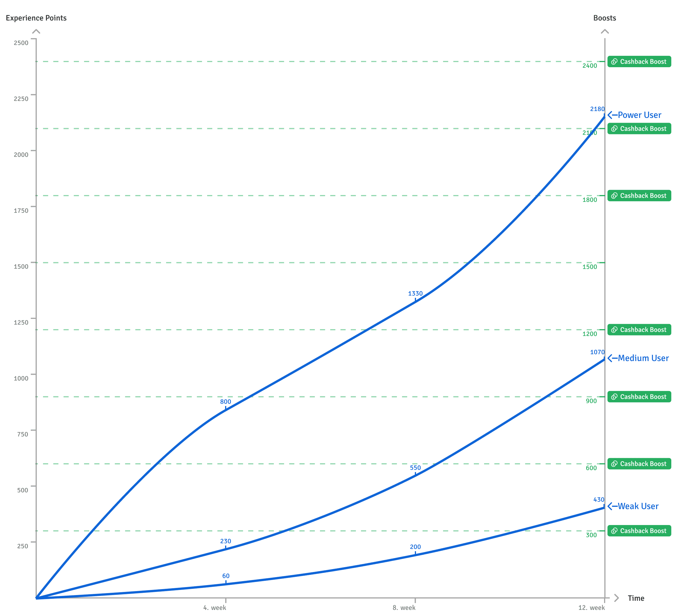 Created a cohesive reward system: EP for instant feedback, boosts for meaningful peaks of value, Direct Cashback for immediacy, and exchanges for partner rewards beyond cashback.